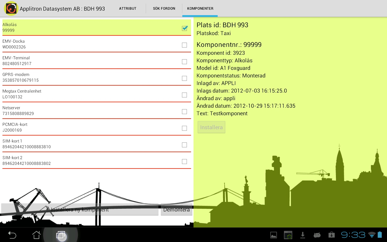 Vänstersidan: Visar installerade komponenter för vald bil. Högersidan: Visar information om markerad komponent.